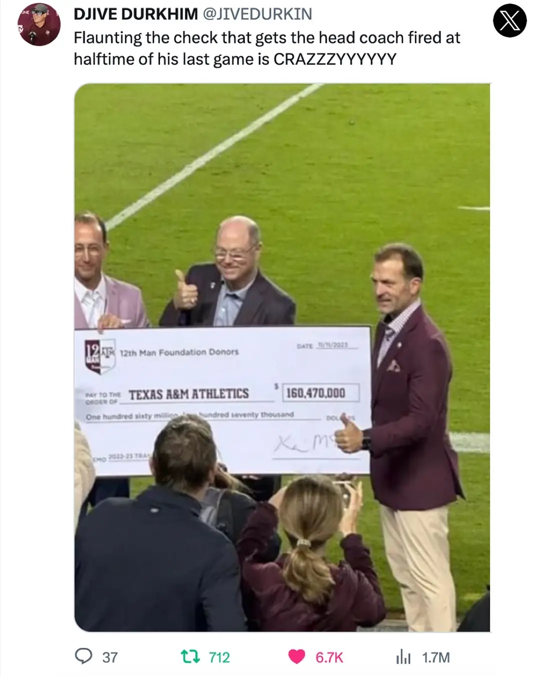 That check didn't mean anything to coach.... the contract is all he cares about.... same will happen with the next coach..... $$$$$$$$ are good for any coach accepting a A&M job.
