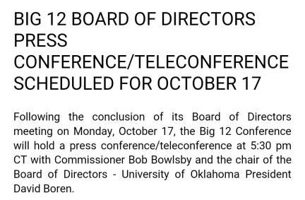 Yosef10 wrote:FWIW a picture has been circulating on Twitter that looks like it is basically the Univ. of Cincinnati's banner they use for a back drop for press conferences and it now has the Big12 logo instead of the AAC logo.