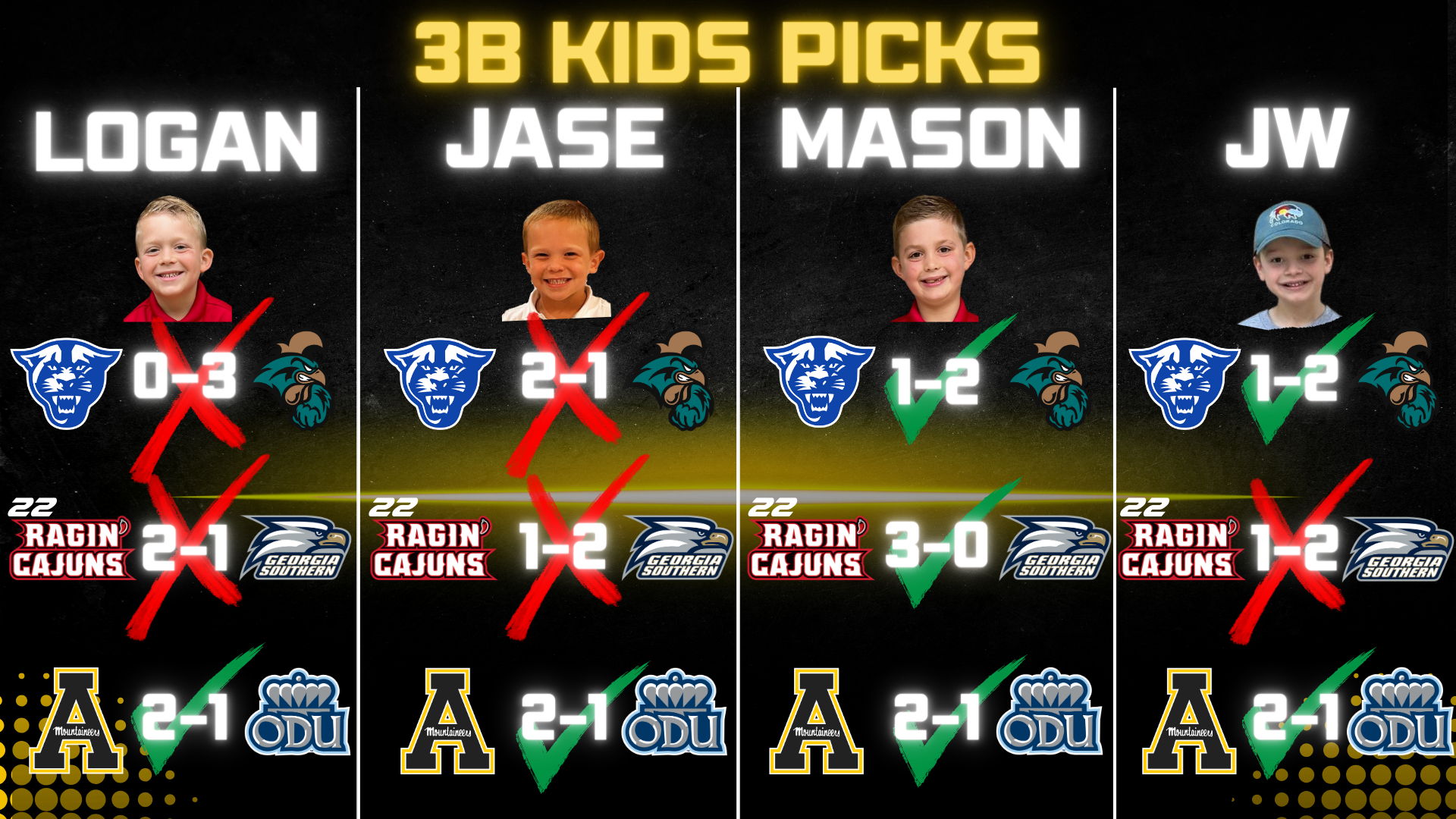 Kid’s results from last week (way to go Mason!) & our picks this week
