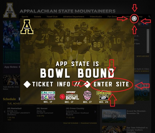 Yeah, that is what I was just told on the phone to ESPN. I'm afraid I'll lose all my Book Marks or favorites.AppStateNews wrote:You are probably using an older, out of date browser then. Try updating your browser and trying again.NewApp wrote:Unfortunately there is not one.AppStateNews wrote:Click the big button that says "Enter Site" on the bottom third of the ad.NewApp wrote:Woops, I just tried that and there's no X on the screen.