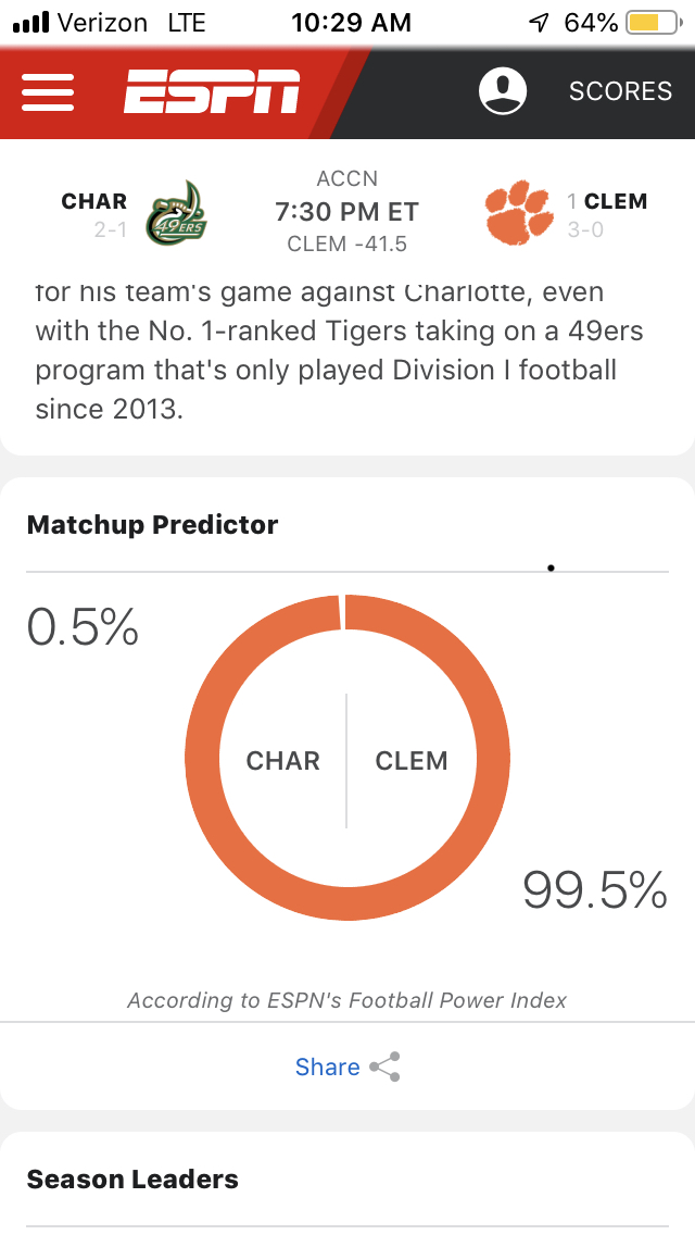 Lots of takes on UNCC. I really saw a pretty good (and much improved) team two weeks ago. A whole bunch of folks on this thread especially are really selling them short and obviously putting a huge amount of blame on the defense- as if UNCC was not capable of moving the ball on us if we had played better defense. Several folks in my area all agreed that their QB is not too shabby and played a great game. He put some of those passes into really tight spaces and ran hard on RPO. Their backs also run hard. Those dudes are going to win their share of games. They will probably get a butt whipping Saturday but I don't think I would shy away from them covering a 42 point spread. They will have a hard time stopping Clemson for sure but Lambert impresses me with his approach.