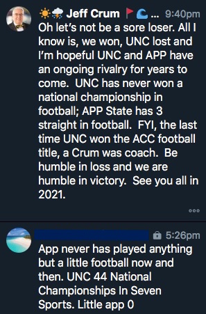 Charlotte was saying the same thing, like defense and turnovers aren't a part of the game.AppRolls wrote: ↑Sun Sep 22, 2019 9:29 pmOver on The Tar Pit there are more level-headed reasonable UNC posters than I would have guessed. But man, there’s a few saying that UNC gave us the game, if only they didn’t have any turnovers, they would have won. Most spoiled, delusional fan base ever, which is why I am ecstatic with our win. How sweet it is!