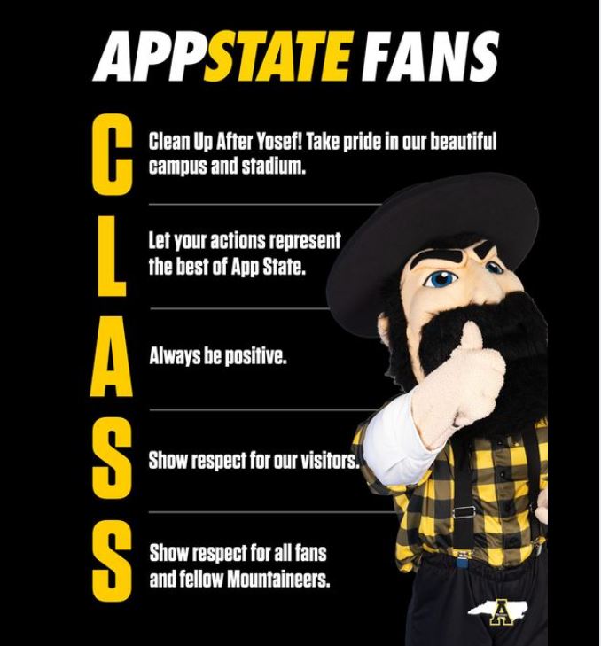 Know it, live it, be it! WE set that standard. Have passion yes, but, keep it respectful. Love it or hate it, Coach Brown is a former Mountaineer. UNC deserves our best both on the field and in the stands. A Crum just said that. UNC was our family biz during the 80s. I, however, am a proud App State graduate. We set the standard in this state of how football should be done. GO MOUNTAINEERS!