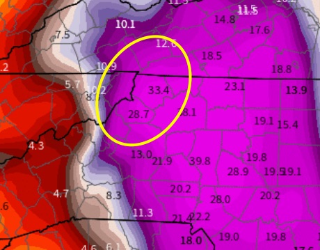 The Euro model is now calling for 40.5 (forty and a half) inches of rain along the Watauga/Wilks border.