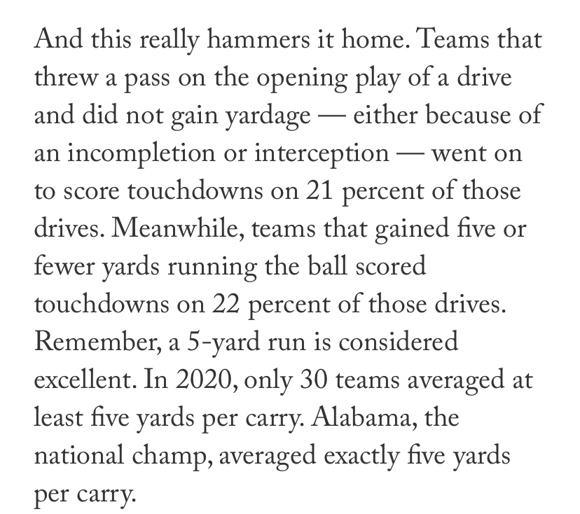 Yeah but it’s not all about just the pass/run ratio though. It’s about when you pass and when you run. I had read an article recently from the athletic that I’m gonna post an excerpt of here. Yeah i know it’s tough to complain about our offense too much, but i just think if we took a little different approach at least 1-2 of the 3 losses last year go differently. It’s not SBC titles i care about, I wanna see us in the NY6 conversation each year and going to that game multiple times. I believe there’s another gear we could hit with just a bit of change on offense.
