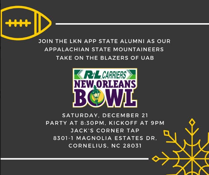 Join the Lake Norman APP State Alumni Chapter at Jack's Corner Tap in Cornelius to watch the Mountaineers take on the Blazers of UAB in the New Orleans Bowl. Saturday, Dec. 21st. Gathering at 8:30pm. Kickoff at 9:00pm Drink Specials: Jack's Corner Tap Specials!!