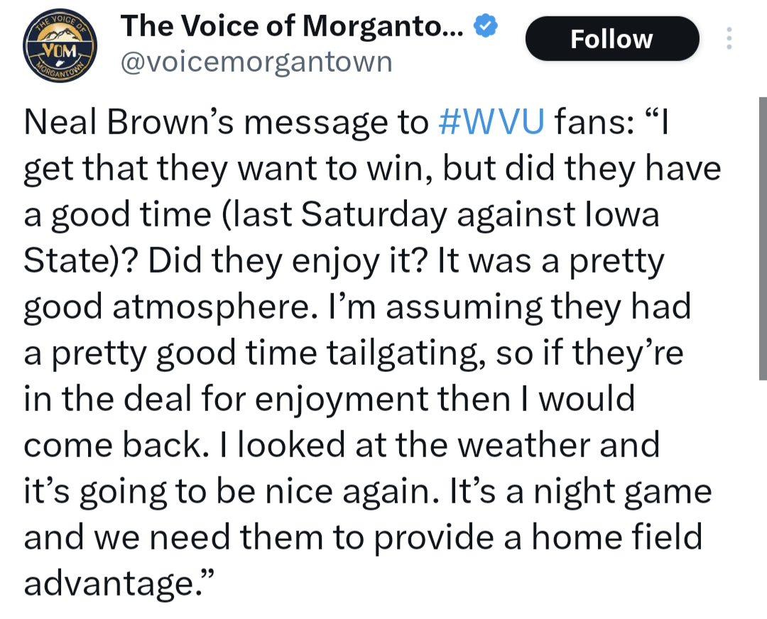 WVU was ranked in top 25 in 6 of 7 seasons in Big 12 prior to Brown. Have there been any major changes in college football since Brown took over at WVU? Not advocating for Brown but this is just a lazy way to look at that job. Not lazy, nor isolated. I'm a West Virginian and did my residency in Mor...