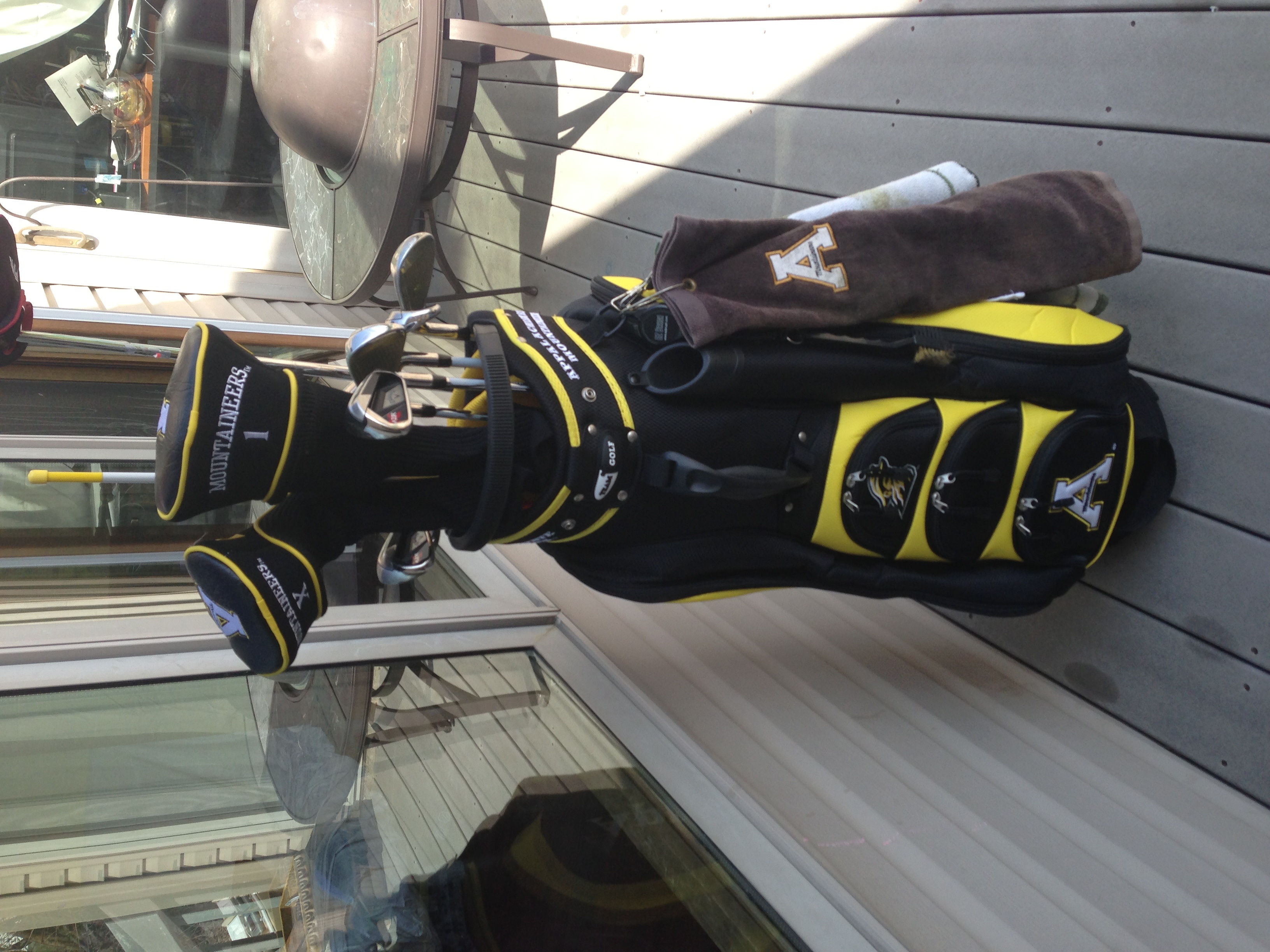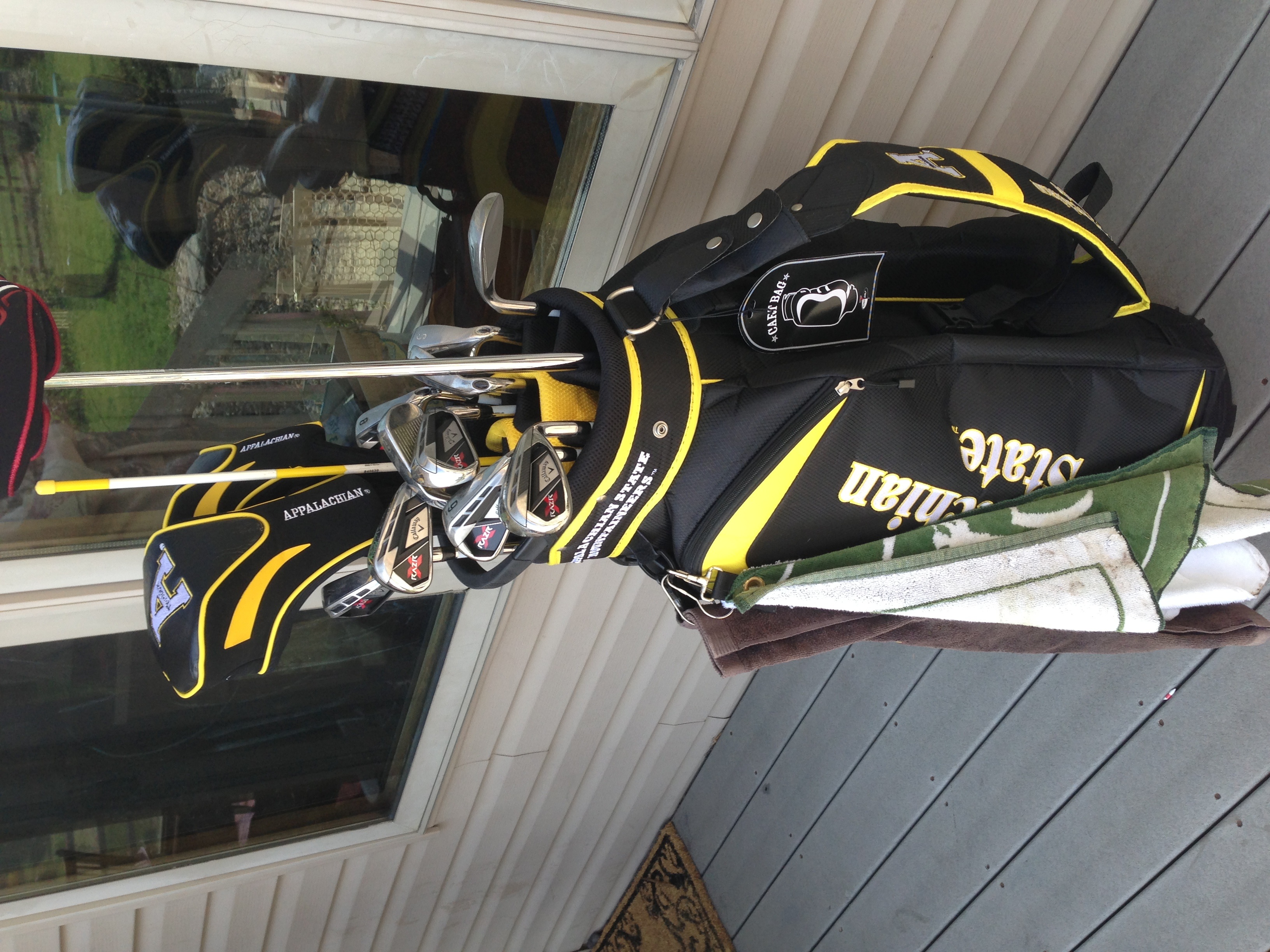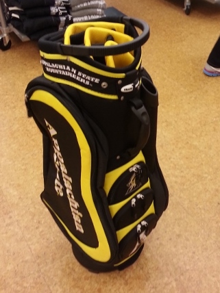 "We offer the current bag for purchase by boosters. I am attaching a picture. It will be the one we use through 2013-14. It is a Nike bag and will come to you personalized with or without the SoCon logo on the ball pocket. Cost is $200.00 which includes shipping and personalization. If you want one let me know shipping address and send check made out to ASU Athletics. On memo line you can put golf bag. Mail to address below. We sell about eight of these bags a year."