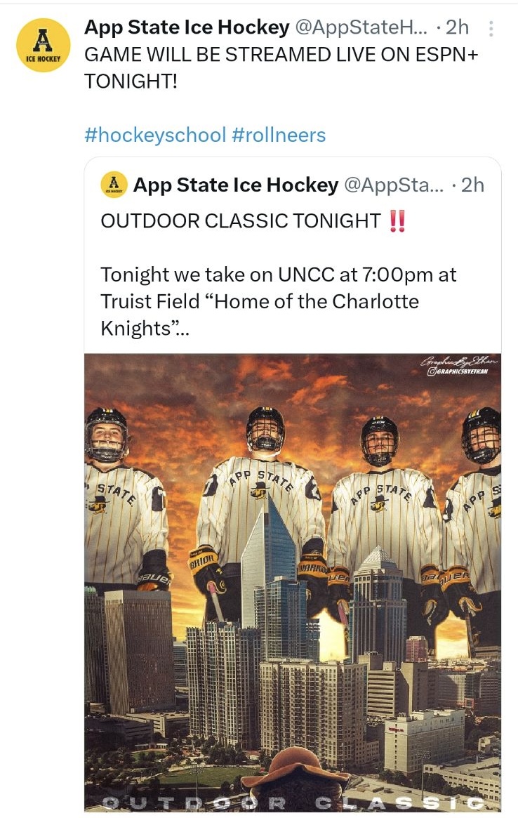 Tickets are now on sale to the App vs UNCC outdoor ice hockey game at Truist Field in Charlotte. Game is scheduled for Friday, Nov. 22 at 7:30pm. It was a great event and very fun time last year. Link for tickets below.