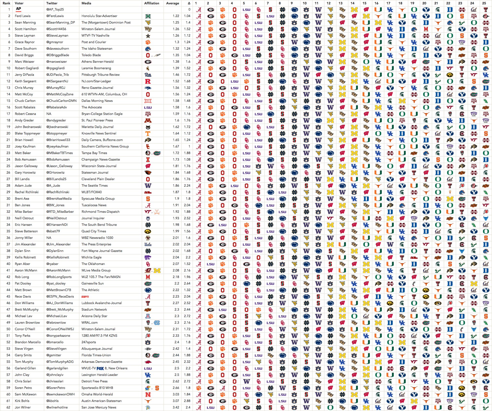 One AP voter (Neil Ostrout) put VT at #12 after their 2 TD loss to then 0-3 ODU. Another voter (Jon Wilner) has the Ducks at #12 fresh off a loss and ahead of UCF & Penn St. respectively.