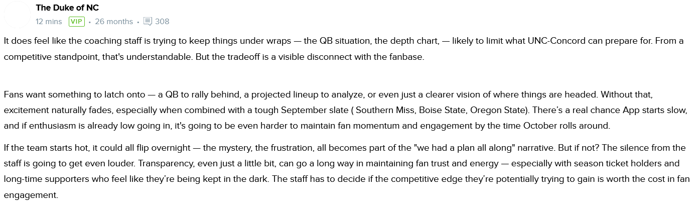 From a personal perspective, would like to see Coach DLo and/or assistants have more informal pressers after practice. If the content is detailed or not, that does not necessarily matter to me at this point. I like a little secrecy during camp. However,...given we have an all new coaching staff, it would nice to see them connecting to fanbase to increase excitement. The overall content does not matter. It will for some at this point, however, not for me