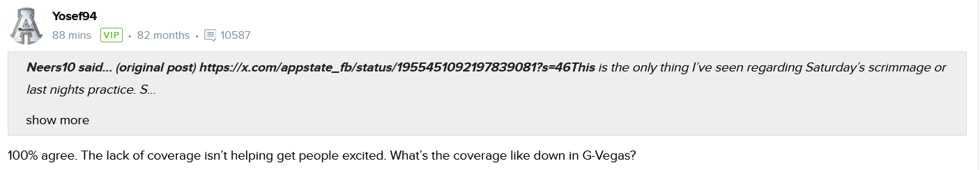There are some complaints on 247 about lack of info and I am curious what folks here think. Some were going to avoid going to the scrimmage but now want to in order to see who plays. I feel like AppStateSports.com is putting out similar stuff to what we got in the past. If anything, I have more excitement to see who will be our stars because we don't know anything. What we do will be praised if we win and if we lose it will be questioned, regardless.