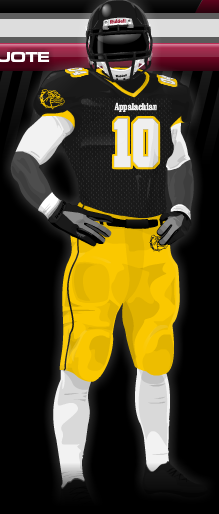 How about keep the helmet the same, have a black jersey with the small Appalachian State logo on the chest- Old School Yosef on sleeve- numbers on shoulders, and gold pants with black stripes. For the road have a white jersey and black pants. On Black Saturday wear all black.