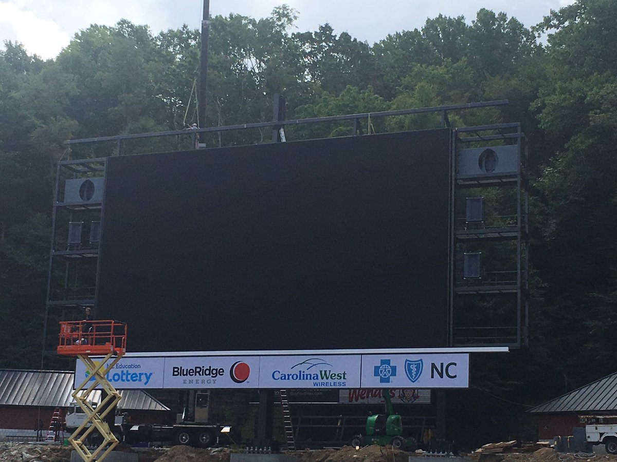 I watched the setting of a few of the speakers today. The far right and far left panels are for the sound system, so those won't have video on them. The speakers will have some sort of reverb / windproofing mesh on them on which sponsor ads will be displayed. That will free up the entire video screen for video other than ads. The speakers I saw were taller than the guys setting them ... I may need to look for seats on Howard's Knob.