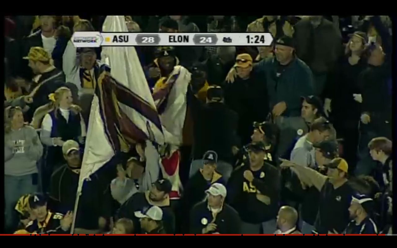 Speaking of arrested: the '09 match featured Elon QB Scott Riddle. At the '11 meeting, Riddle was an alum enjoying the matchup in the Kidd Brewer East press box/club area, where my buddy (appftw) saw him and determined pretty easily that he was intoxicated. Early the next morning Riddle got in a bar brawl and got stabbed three times. This is the same guy who started the biggest brawl in SoCon baseball tournament history.