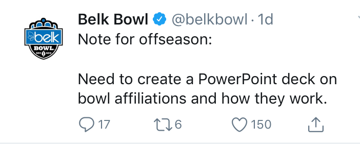 Would be interesting if this was their way of saying "we read your article and your sources were misinformed". They seem to enjoy trolling though. Must be nice to get paid to tweet.Overcashed wrote: ↑Tue Dec 03, 2019 10:55 amI mean it's not going to happen but the fact that the Belk Bowl social media team is messing with Ethan on Twitter is hilarious.