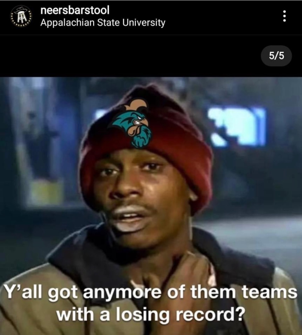 Nobody from App needs to put CCU down. It took a lot to beat them and while they are not top 15 they are definitely top 25-30 caliber. I think CCU, App, and ULL are all legit top 30 teams when we play our A game. The last two games have featured several future NFL players. No reason to hate on any of the 3. I do feel ULL and App are both a little more talented but Coastal is a real good team.