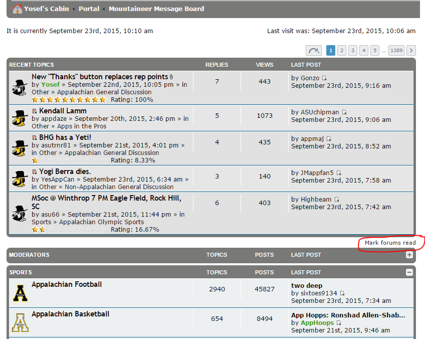 On each forum main page (and on the message board page) there is a button on the right just above the first post/forum that says "Mark Forums Read" or "Mark Topics Read". That should do the trick on marking forums read for you.McLeansvilleAppFan wrote:We need a special button just to post all the goodness that is classic Simpsons. That is my only request at this point.AppinVA wrote:On a semi-related note, I just found out that posting youtube videos is a lot easier now.